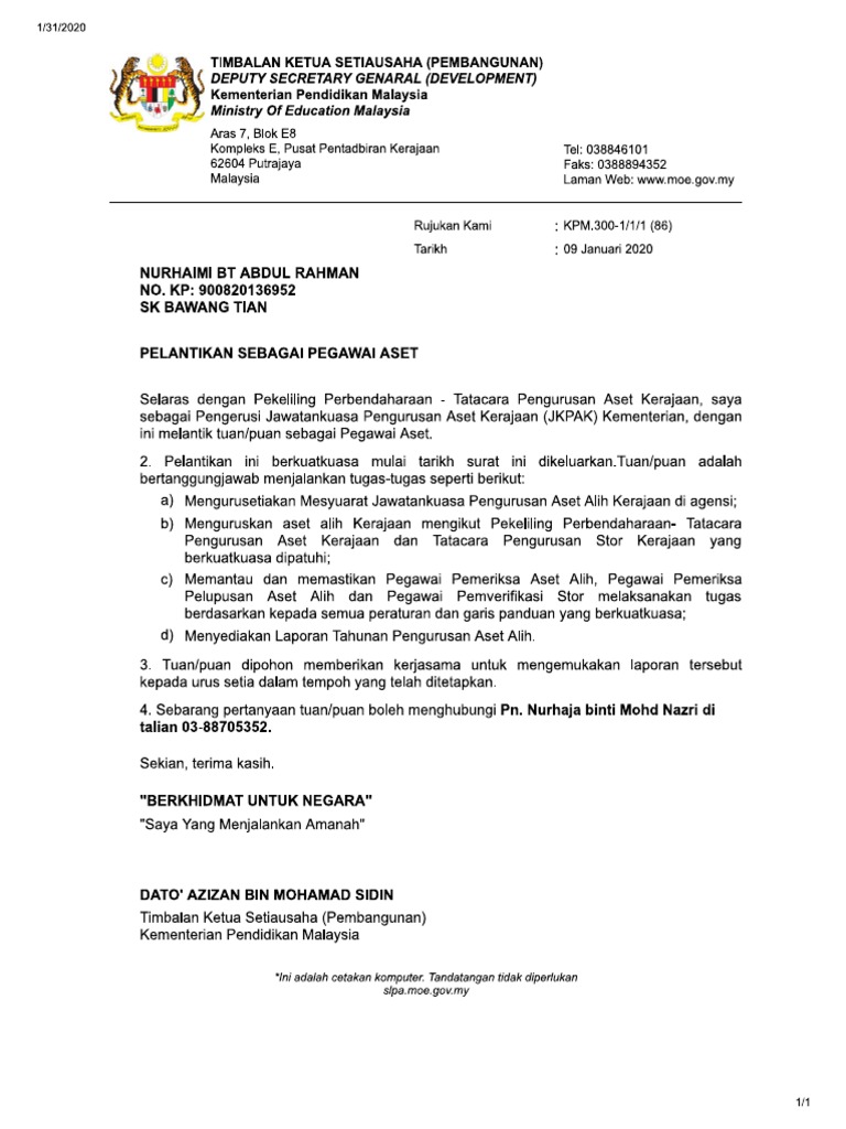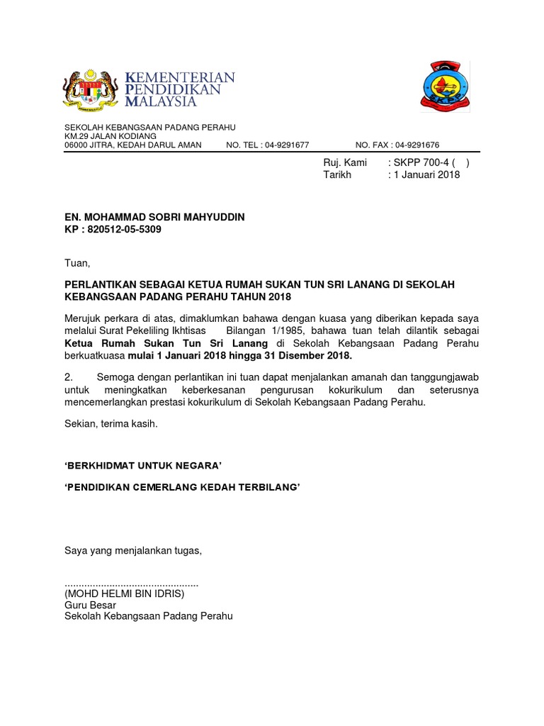 Aug 16 2020 iii surat pelantikan pertama skim perkhidmatan pendidikan di gred dg29 dan surat pengesahan kenaikan. Contoh Watikah Pelantikan Pengawas Sekolah. Contoh surat permohonan caruman lewat bayar perkeso fclb nadiahamdan.